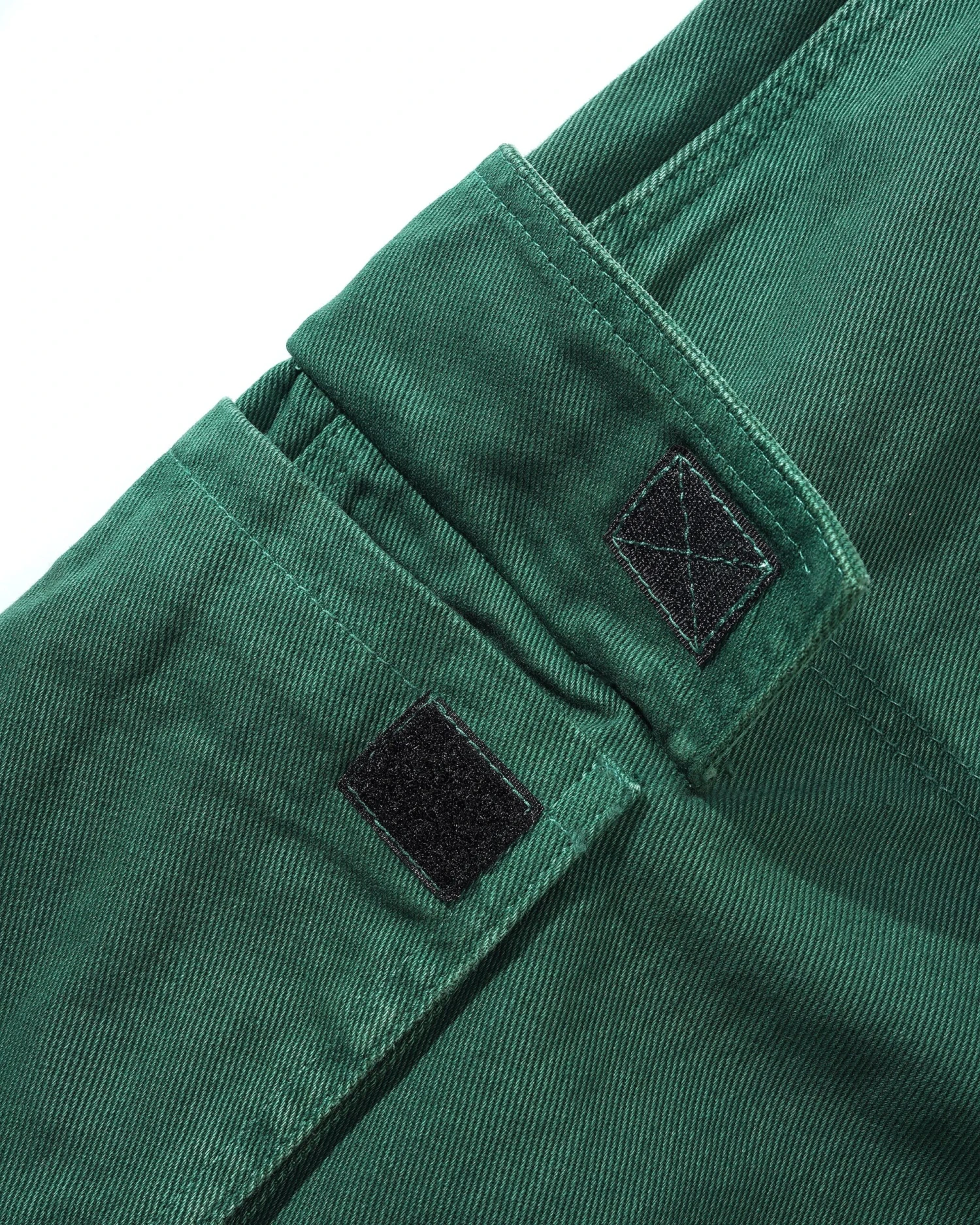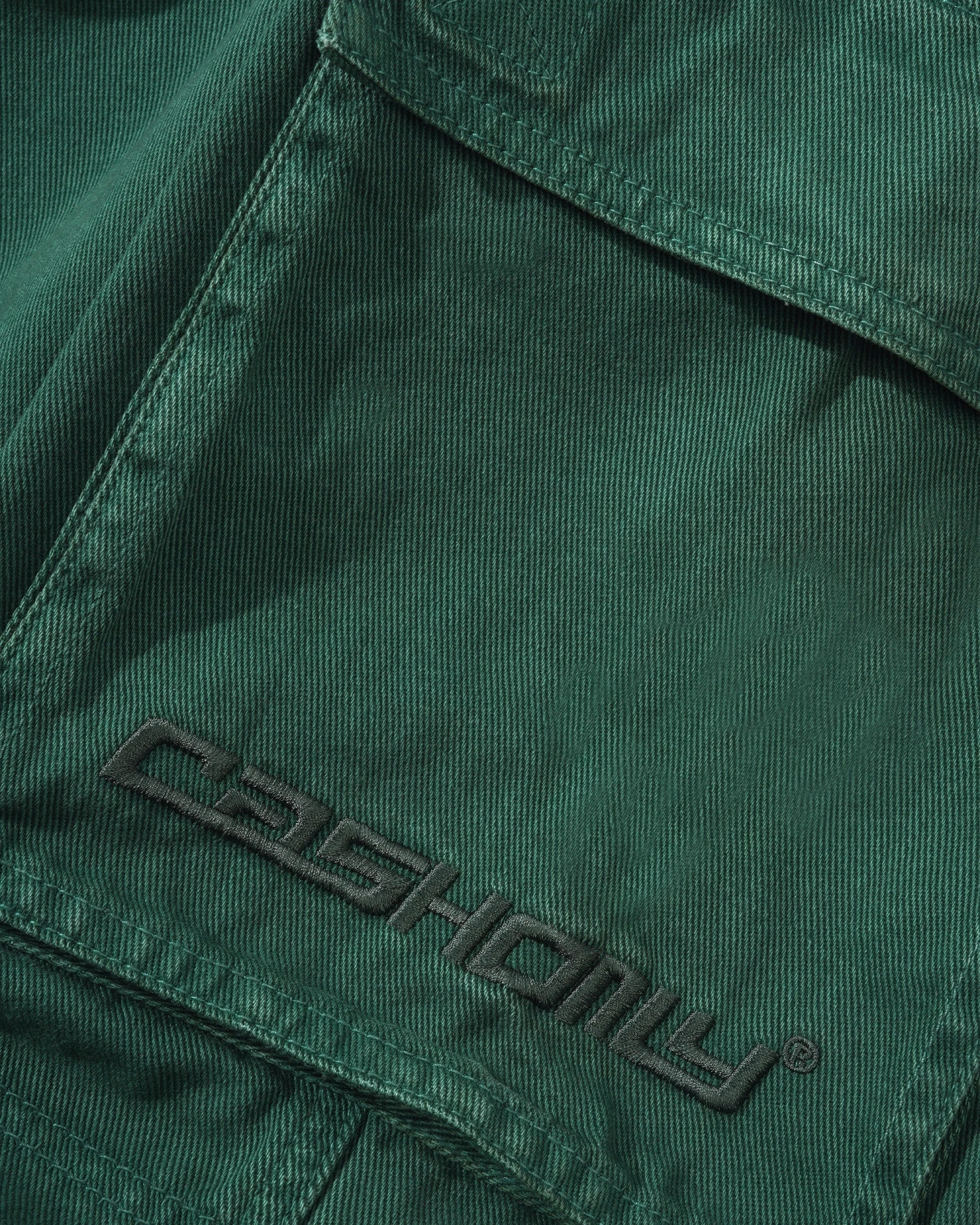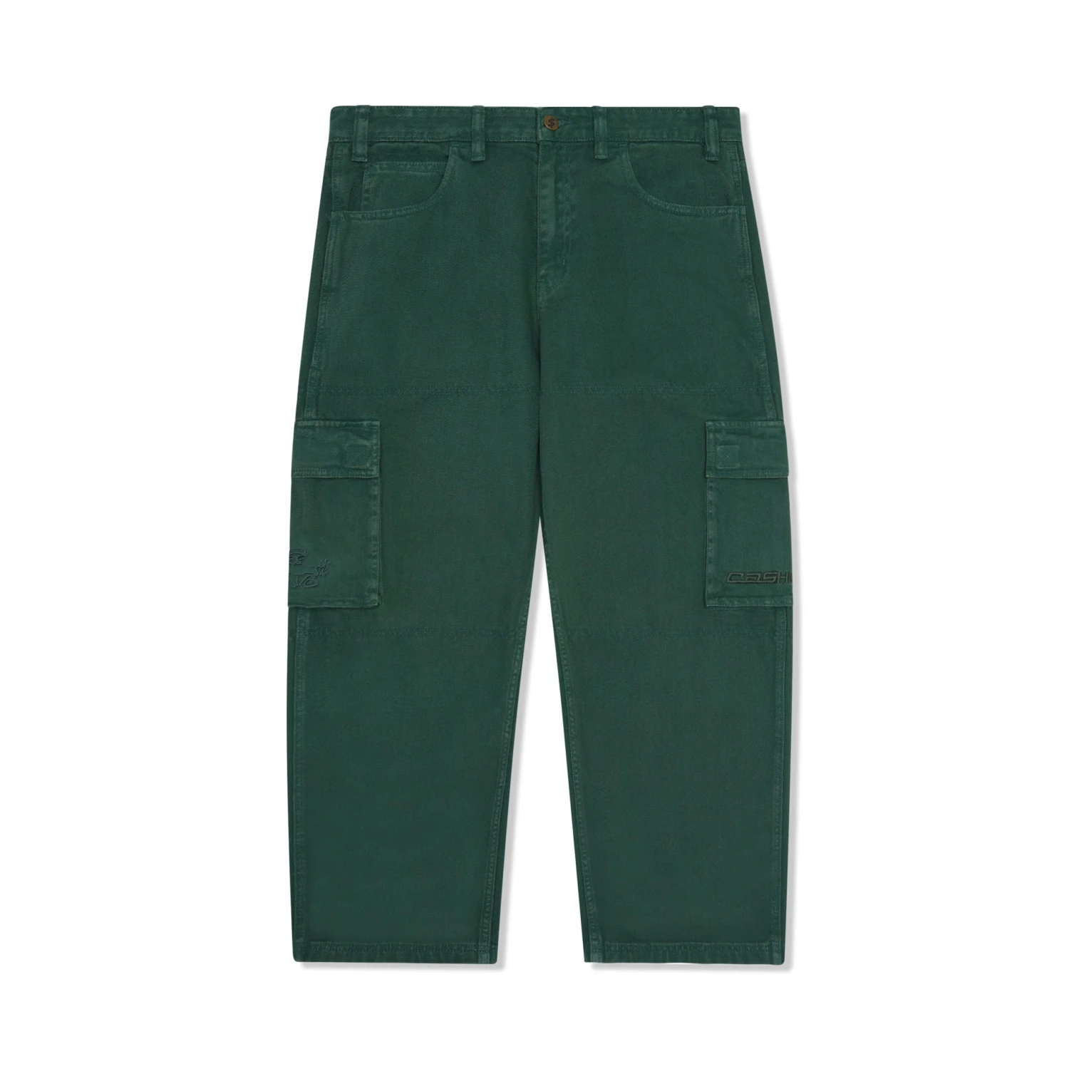 3D cargo pockets on sides with brass button closures & embroidery