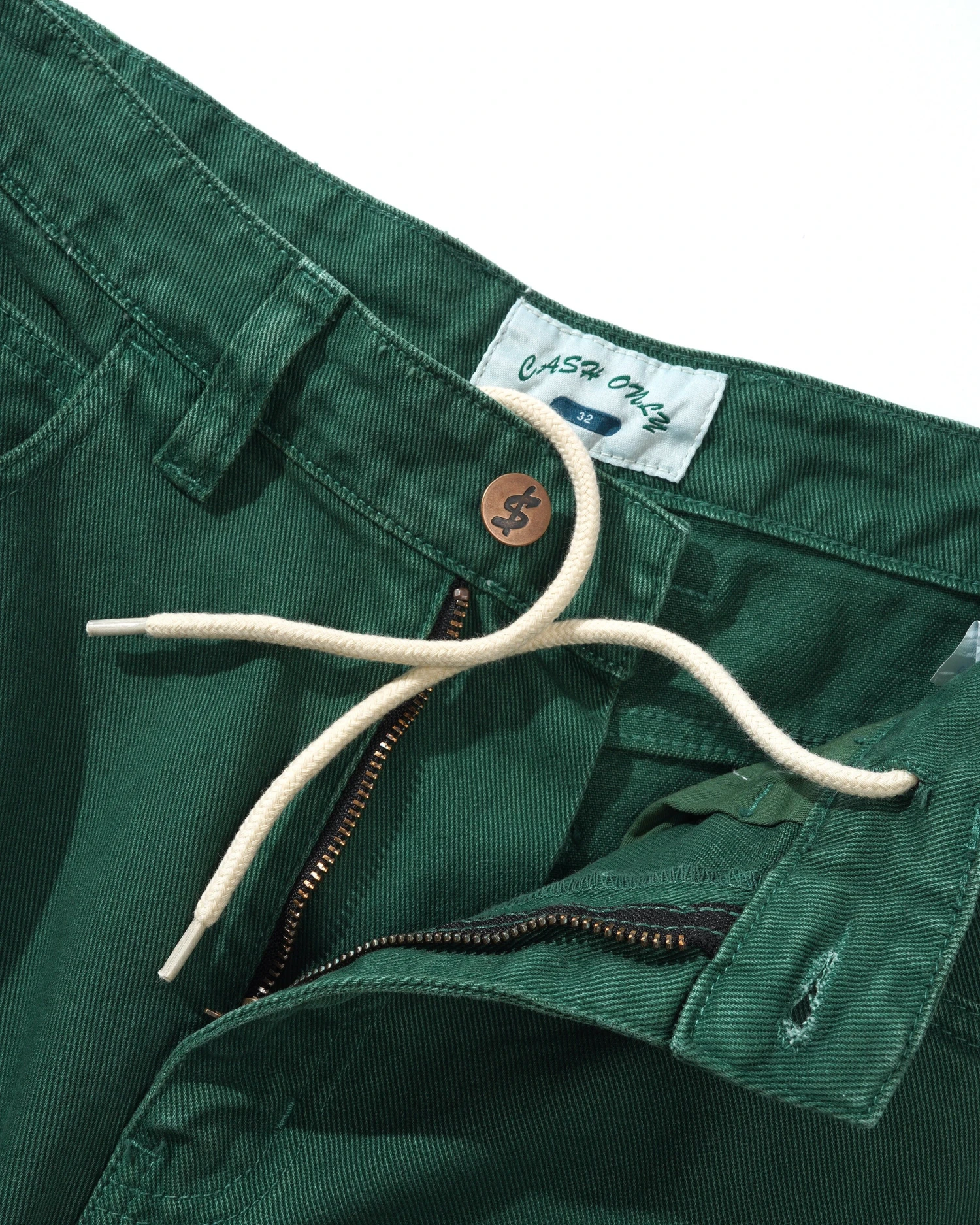 Brass logo button with zip fly closure