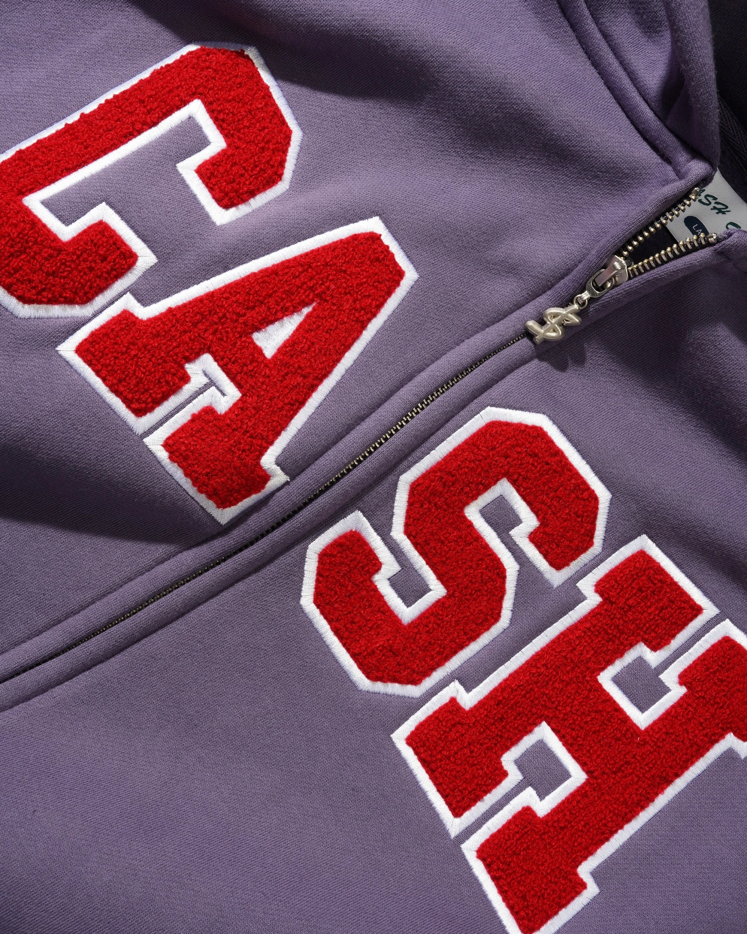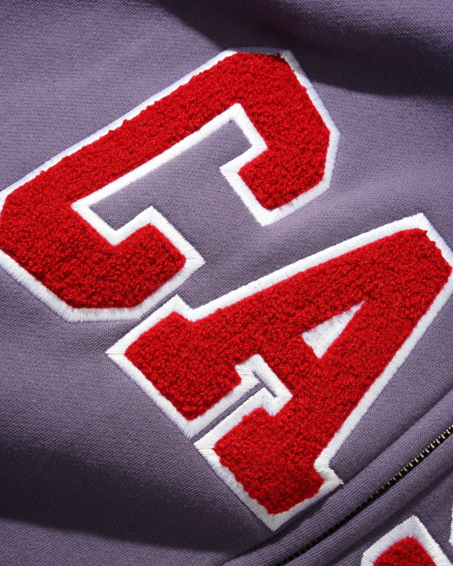 Chenille appliqué with direct embroidery on front